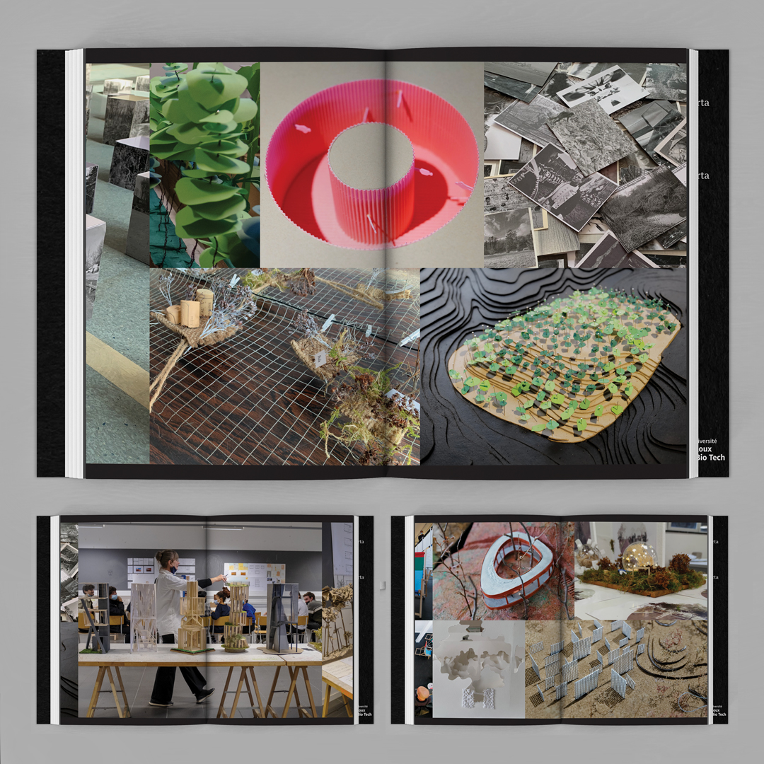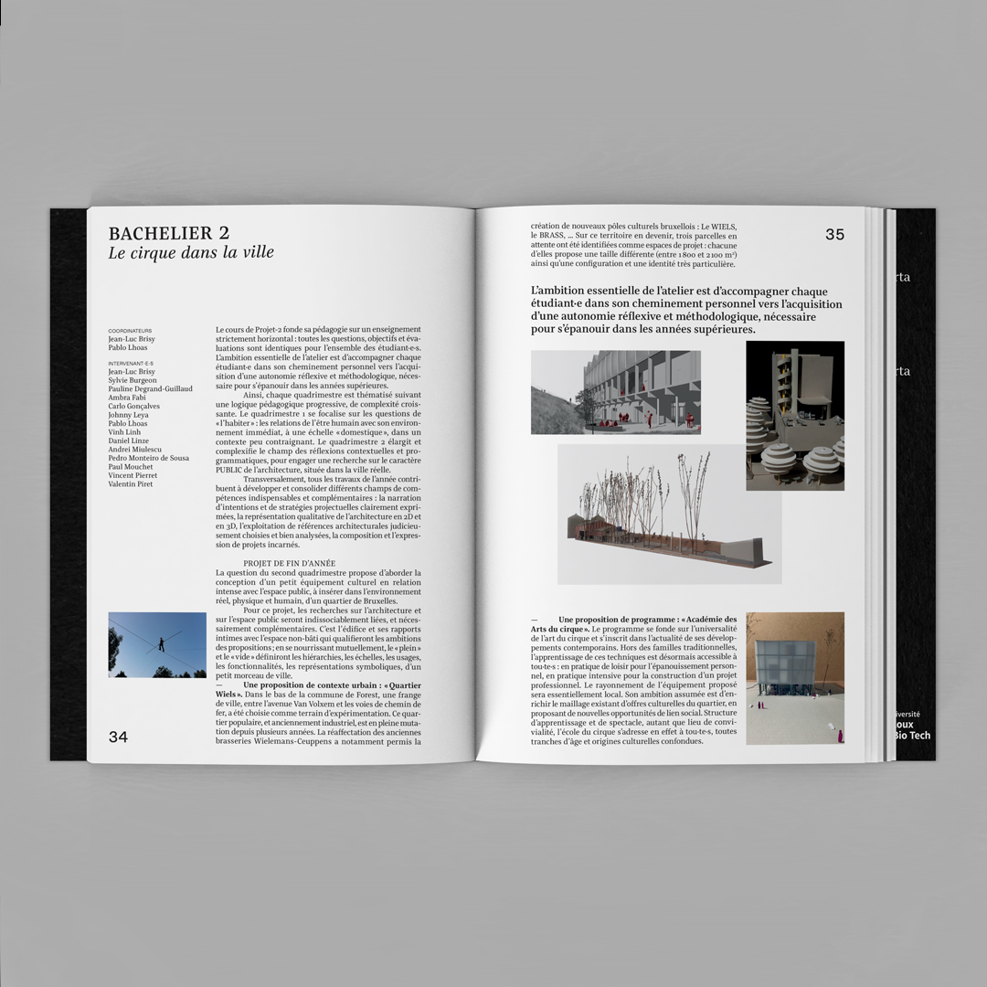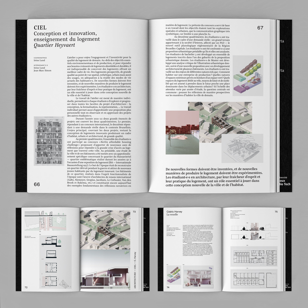 - une sélection de projets remarquables, par année d'étude (BA1/BA2/Paysage) et par atelier vertical (BA3-MA2) ainsi que les productions de certains cours théoriques ;