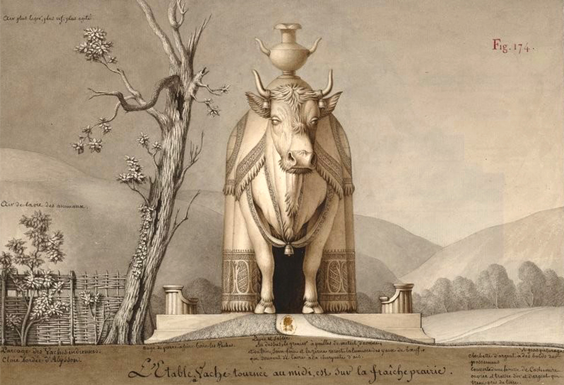 Lequeu, J.-J. (n.d.). L’étable à vache tournée au midi, est sur la fraîche prairie. Extract from Architecture civile [Illustration]. Bibliothèque nationale de France, Paris, France